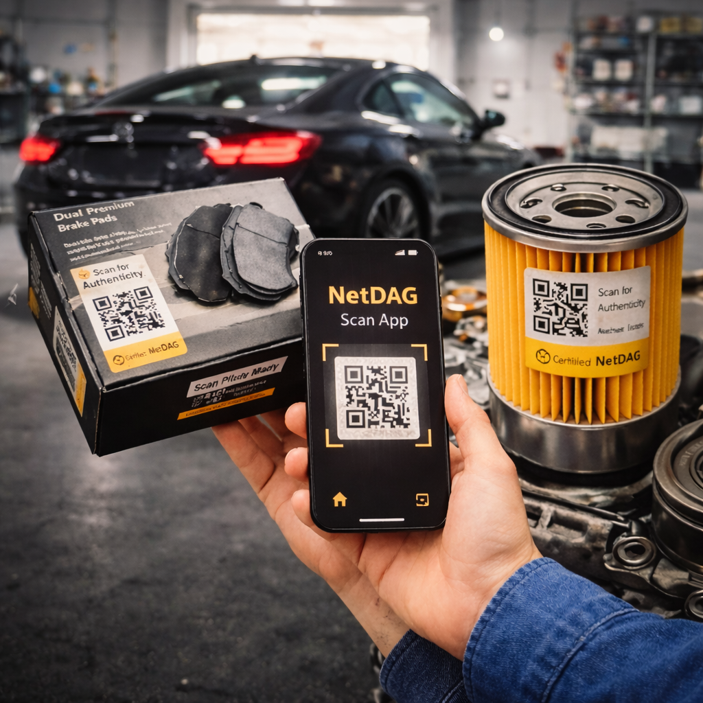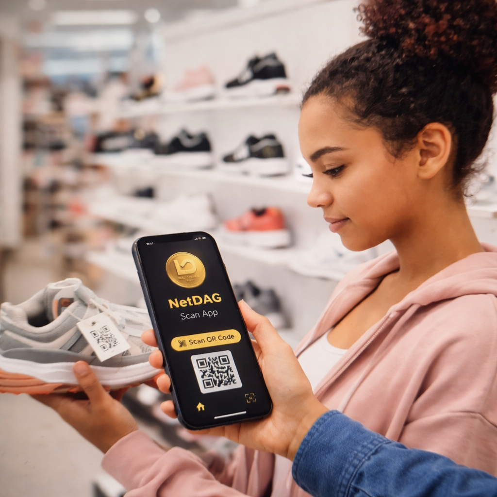 A NetDAG QR tag (or compatible QR/NFC label) is applied on packaging or the product itself, creating a unique, scannable identity.